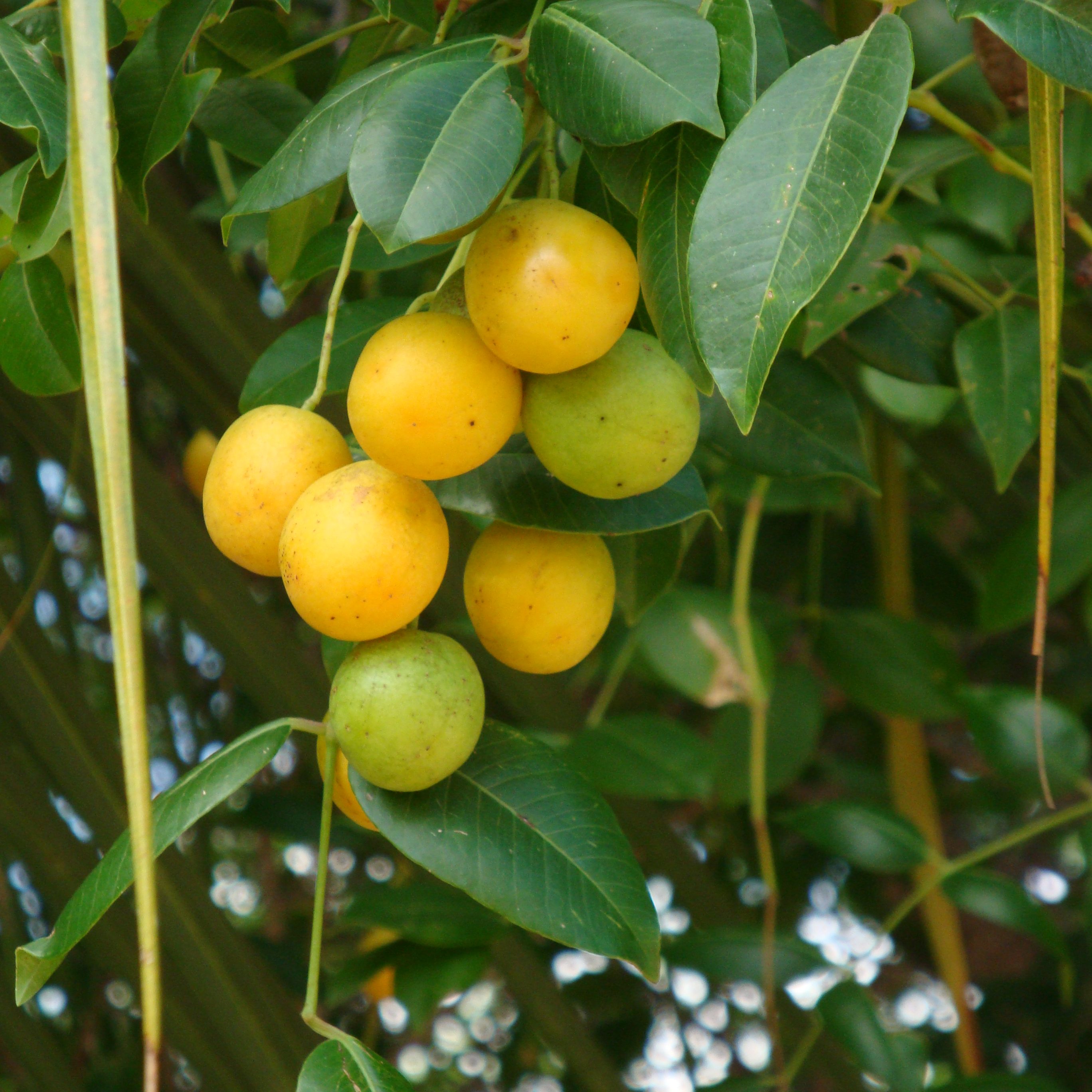 Robust and prolific, bearing delectable fruits in both their green and ripe states, and featuring a widely available dwarf variety, the Ambarella is extensively cultivated across the tropics for evident reasons. Belonging to the Anacardiaceae family and therefore being a relative of the Mango, the Ambarella is commonly consumed in its green state. When eaten green, the fruits are peeled, halved, and coated in a mixture of salt and seasonings. Although somewhat insipid on its own, the fruit provides a satisfying crunch and a mild taste that complements the seasonings. Upon ripening to a golden hue, the flesh softens, unveiling a sweet and sour flavour reminiscent of Pineapple, Starfruit, and Mango, accompanied by a distinct Pineapple fragrance. The Plum-sized fruits, shaped like plums, have noticeable fibres surrounding the core. Ripe fruits can be transformed into jams or marmalades or enjoyed stewed. In subtropical regions, the Ambarella yields fruit from May to August, offering valuable winter produce. Originating from Melanesia and Polynesia, the Ambarella has now spread widely across the tropics, thriving in tropical and subtropical conditions like its relative, the Mango. The plants thrive best in a location sheltered from strong winds and in full sun. While partial shade may be beneficial in early years, it can diminish fruiting once the plant matures. Although brief, light frosts are tolerated, they may lead to leaf drop (if not already occurred) and should be avoided if possible. As long as the soil quality is not notably infertile, poorly drained, or highly alkaline, the Ambarella has minimal soil requirements. The dwarf form is preferable for those with limited space or in cooler climates, allowing for pot cultivation and relocation to a warm, sheltered spot in winter, akin to dwarf mangoes. Being a medium-sized tree with vigorous growth and abundant fruit production, the Ambarella may, at times, overproduce to the detriment of its own health. The long penduncles of the Ambarella yield sizable clusters of up to 20 fruits that ripen to a golden yellow. The glossy pinnate foliage is glabrous, and the inconspicuous small white flowers add to its appeal. In tropical conditions, the Ambarella can grow up to 15-18m tall, exhibiting semi-deciduous tendencies in dry, winter climates, much like its relative, the Red Mombin. Dwarf varieties, staying below a manageable 4m with smaller fruits, are available, boasting quicker fruit-bearing and reportedly longer fruiting seasons. Whether enjoyed as a crisp, crunchy vegetable in its green state or savoured in its ripe, soft, sub-acidic form, the Ambarella requires minimal care and maintenance, providing a bountiful harvest during a largely uneventful fruiting period. Embrace the abundance and plant an Ambarella to fill the gap in your garden.