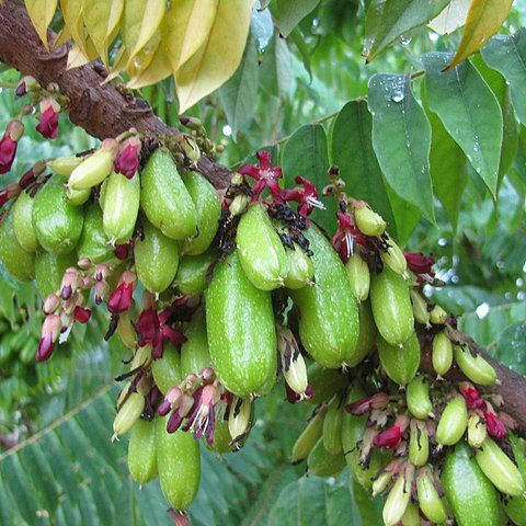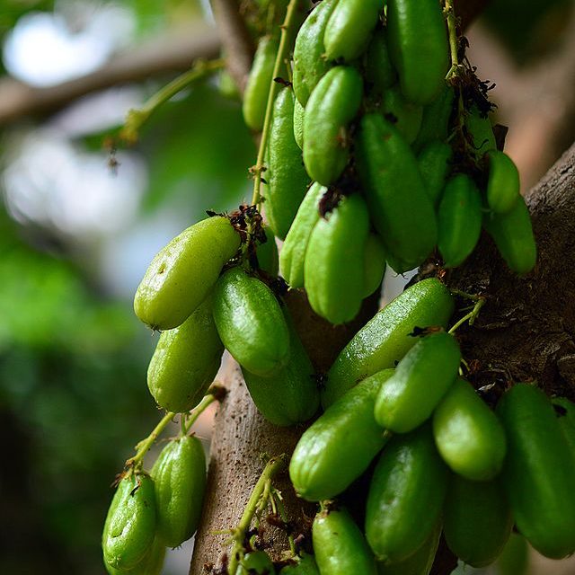 Native to the Spice Islands (the Moluccas) of Indonesia, the Bilimbi is a distinctive tropical tree known for its prolific production of small, cucumber-shaped fruits, earning it the moniker “Cucumber Tree.” These green, cylindrical fruits are highly valued in South East Asian and South Asian cuisines for their crunchy, juicy texture and intense, sharp acidic flavour. Resembling small cucumbers, the Bilimbi fruits measure at most 10cm, featuring glossy, pale green skin that matures to a light yellow hue. Exceptionally sour, even surpassing the acidity of Limes, Bilimbi’s mouth-puckeringly sour flavor is its defining characteristic. Similar to the Star Gooseberry, Bilimbi is seldom consumed on its own but rather processed or used as a sour accompaniment. When paired with salt and chili, the fruits become enjoyable and are commonly eaten this way. Bilimbi serves as an outstanding substitute for other sharp, acidic flavours, with its juice being utilised as a vinegar replacement or in lieu of sour Tamarind or Limes. Belonging to the Averrhoa genus alongside Carambola, Bilimbi shares a similar appearance in terms of both foliage and flowers, being an aesthetically pleasing addition to any location. Trees are covered in pinnate leaves arranged alternately along stems, drooping attractively for a distinct appearance. Fragrant, self-fertile flowers resemble those of the Carambola, emerging in clusters with dark purple, crimson blossoms. Cauliflorous like the Jaboticaba, Bilimbi trees bear fruit along the trunk and main branches, displaying abundant clusters of cucumber-like fruits. Bilimbi are more cold-sensitive than its Averrhoa relative the Carambola, struggling outside tropical climates and may be only marginal in subtropical regions. A full sun position in a well-draining soil is optimal with specific soil requirements being minimal although slightly acid, deep, fertile soils are preferred. A distinct dry season, lasting up to three months, is important for productivity and inducing flowering, which occurs during this dry period. In more marginal climates, protecting plants from strong winds is advisable. Widely cultivated across South East Asia for its sharply acidic fruits, Bilimbi is of exceptional culinary value and adds an enjoyable sight to any garden.