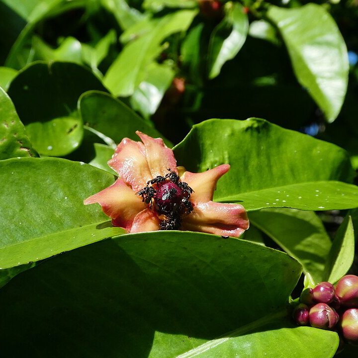 The Button Mangosteen, also known as Cherapu, is a relatively unknown and underappreciated member of the Garcinia genus. Bursting with delightful flavour, its juicy, sweet flesh has a pleasant acidity and is often compared to the taste of a Tangerine. The orange-skinned fruit resembles a Persimmon in appearance, featuring succulent orange flesh that contains only a few relatively small seeds. Unlike many other Garcinia species, the Button Mangosteen has a thin rind, which is bitter, and the flesh closest to it can have a slightly resinous or latex-like taste. Usually eaten fresh, the fruit can also be used to make jams. As a member of the Garcinia family, it is related to the Purple Mangosteen, Achacha, Lemon Drop Mangosteen and Yellow Mangosteen. Native to the lowland, humid tropics of Thailand and Peninsular Malaysia, the Button Mangosteen generally requires growing conditions similar to other Garcinia species, particularly the Purple Mangosteen. It is a very slow-growing but long-lived plant, often beginning to fruit at a height of just 3 feet. The species is not drought-tolerant and has minimal resistance to cold, suffering damage at temperatures around 3 degrees celcius. It thrives in slightly acidic, deep loam soil with good drainage. The Button Mangosteen develops a narrow, dense form, growing up to 10 metres tall. It features ornamental, rose-coloured, camellia-like flowers and attractive, dark green, glossy leaves, similar to those of the Purple Mangosteen.