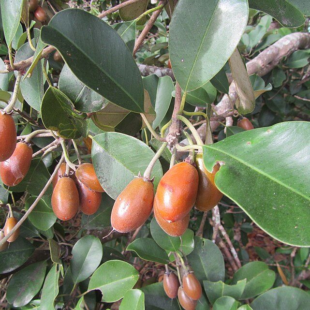 A bite-sized Sapodilla, perfect for those with a sweet tooth and looking to add a larger evergreen tree to their food forest. Caqui fruits are 3–4 cm long, roughly the size and shape of an oval Kumquat, and bearing resemblance to the Jambolan Plum, though they have orange-red skin. When fully ripe, they’re considered to have a very pleasant flavour, similar to that of the closely related Sapodilla, which is often described as tasting like brown sugar or molasses. Caqui is also related to other members of the Sapotaceae family, such as Abiu and Mamey Sapote. Its flavour is sometimes compared to Dates and Pears, though some find it sweet but a little bland. While Caqui has been enjoyed throughout its native range for generations, it’s not widely cultivated. Caqui has a broad native range, stretching across much of South-East Asia and tropical northern Australia. It’s well-suited to a variety of tropical environments, particularly those with a monsoonal or distinct wet-and-dry climate. While it thrives with abundant rainfall, it also shows good tolerance for dry periods within its native habitat. It prefers well-drained soils, such as sandy loam, and grows well in a protected position with either full sun or part shade. Like its relative, the sapodilla, caqui can be grown in subtropical climates, though it may grow more slowly. Some sources suggest it can tolerate light frosts on rare occasions. Caqui is a slow-to-fruit species, often taking more than five years to begin producing fruit. Caqui is a moderate to large tree, reaching 25 to even 30 metres in height when fully mature, making it unsuitable for small backyards but ideal for larger orchards or food forests. It has a low-branching habit, with glossy green leaves that contrast beautifully with their pale grey undersides. Cream to white flowers appear in the leaf axils.
