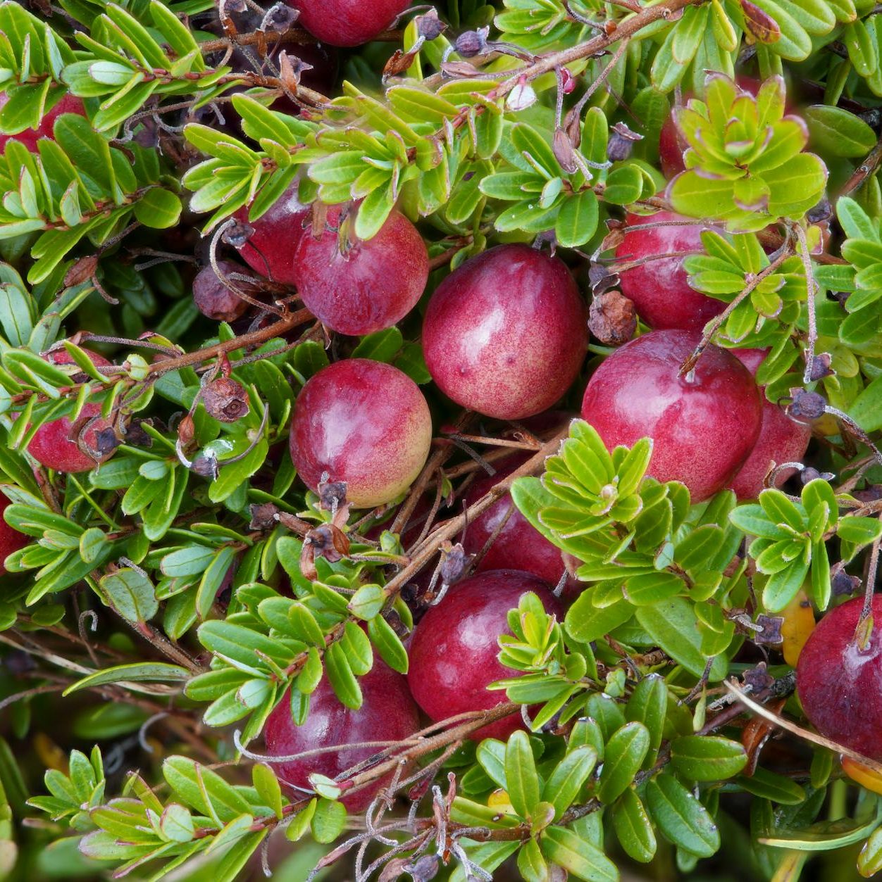 Native to the acidic peat bogs of North America, the Cranberry is a ground-level trailing shrub best known for its small, red, tart berries. An iconic fruit of North America, the Cranberry bears naturally tart and acidic fruits roughly the size of a Blueberry, to which they are related to being in the Ericaceae family. Cranberries do not sweeten during the ripening process, as they mature from white to a vibrant red colour. The tart fruits are notably high in antioxidants and Vitamin C, and are overwhelmingly processed into a variety of different, delightful products. Dried cranberries are frequently enjoyed as a popular snack, particularly in trail mixes; cranberry sauce holds an iconic and beloved status as a condiment during Thanksgiving and Christmas in North America, while cranberry juice is enjoyed across the globe. Cranberries thrive in cold temperate climates and are well-suited to highland and alpine regions of Australia, such as the Highlands of the Southern and Central Great Dividing Range, or much of Cool Temperate Tasmania. Plants require a minimum of 1000 chill hours, making them suitable only for high-chill climates. Native to the Peat Bogs and Swamps of North America, the Cranberry prefers highly acidic, moist soils, preferably in full sun but also being adaptive to partial shade. Plants can prefer well-draining soils but plentiful water and growers will sometimes add sand to soils to improve drainage and pest resistance. Gardeners might presume that Cranberry plants consistently grow submerged, but this perception arises from commercially cultivated plants undergoing two submerged periods – the first occurring during winter, where the water acts as a protective layer, and the second during harvest when fields are flooded to enable the buoyant berries to effortlessly float to the surface for convenient collection. Cranberry plants are slow-growing and may take up to five years before fruiting, but are long-lived despite their small size, producing for over 100 years once mature. Cranberries are perennial shrubs that create a low-lying, spreading ground cover, reaching a modest height of 20-30cm but extending several meters in width, forming a natural green carpet or living mulch. Their compact size and expansive width make them ideal for container or raised bed cultivation, allowing vines to gracefully sprawl over edges. Notably, foliage is evergreen but matures in colour throughout the seasons, with the small, glossy leaves maturing from a dark green in summer to a coppery-red in autumn-winter. The drooping flowers exhibit a delicate pink-white hue. Ideal for ground cover in a moist, slightly shaded area in any cool to cold temperate garden, cranberries with their sharp, flavorful fruits are a true culinary delight.