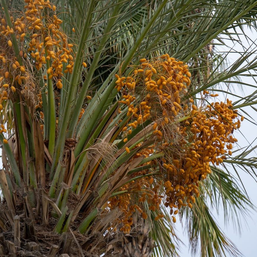 A desert dessert, sweet as honey and perfect for gardeners in arid climates, cultivating your own delectably sweet Date Palms offers a splendid opportunity to produce abundant crops of fresh dates, all while enjoying varieties not available commercially. Dates, whether enjoyed dried – offering a delightful sweetness and richness – or consumed fresh, exhibiting a milder taste with a subtle astringency, make for a delectable treat. Cherished throughout North Africa, the Middle East, and South Asia, Dates boast a rich history of cultivation spanning thousands of years. These versatile fruits find their way into delectable desserts like puddings and cakes, breads, and salads. Technically classified as drupes, Dates contain over 60% sugar by weight when dried, offering a delightful and natural sugar boost. Cultivating Dates at home further provides gardeners with the opportunity to savour varieties that are not commonly found in retail outlets. There are three commonly available varieties: the Medjool, a popular commercial variety known for its soft flesh and rich flavour; the Khadrawy, which has a milder taste with less sugar but a moister fruit; and the Honey Barhee, often considered the sweetest, with an exquisite flavour of honey and caramel. However, it is more prone to bruising and doesn’t store as well. Thriving in the arid landscapes of hot, dry tropical Deserts, the Date Palm possesses specific requirements and tolerances. Date Palms are remarkably resilient, ranking among the most salt-tolerant fruiting plants, alongside Coconuts. Additionally, they exhibit tolerance to robust winds and harsh drought conditions, although fruiting may be notably affected. Indigenous to hot, dry climates with low humidity and rainfall, Date Palms necessitate substantial irrigation during the fruiting stage, reaching up to 300 litres per tree to simulate conditions akin to access to the water table. It flourishes in slightly alkaline soils with superb drainage, conditions commonly found in deep sandy loams prevalent in desert environments. These dioecious trees, with distinct male and female plants, only reveal their gender during flowering, a process that can extend beyond 5 years for seedling-grown specimens. Cold tolerance remains somewhat ambiguous, with varying sources citing figures ranging from -11 degrees Celsius during dormancy to others indicating a general range of -4 to -5 degrees Celsius. To promote airflow and reduce the risk of disease, it’s advisable to prune away dead growth and spent flowers. Similar to how the coconut symbolizes the tropical coast, the Date Palm stands as an icon of the Desert Oasis – a lush haven contrasting the arid and relentless sand dunes. Its crown of slender, feather-like fronds gracefully arches, extending up to 6 meters in length. The Date Palm’s slender, columnar trunk is rough due to the presence of old, dry frond bases clinging to the trunk. Plants can attain an imposing height, ranging between 15-30 metres. Luckily given thier stature, Date Palms are generally low-maintenance. However, occasional interventions such as hand pollination and the application of nets to shield fruits from pests may be necessary. With an extensive root system reaching up to 6 metres deep to access groundwater and spreading widely, Date Palms prove to be enduring choices. Yet, their extensive roots can pose challenges for plumbing systems, making them a potential concern for long-term planting choices. Date Palms boast high ornamental value, presenting impressive clusters of flowers and subsequent fruit, making them an ideal choice for harsh, exposed arid locations where you desire to cultivate a productive tree. Growing Dates at home not only allows you to relish a diverse array of varieties but also proves cost-effective, making it a rewarding endeavor for any gardening enthusiast.