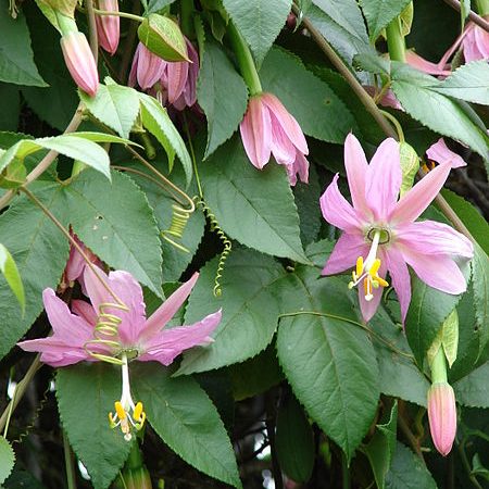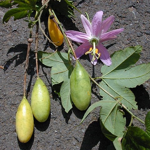 A distinctive and interesting member of the Passiflora genus, the Banana Passionfruit thrives even in cooler climates, surpassing the cold-hardy black varieties of Passiflora Edulis. The delicious Banana Passionfruit presents a unique opportunity for those seeking a robust fruiting vine. Despite its name, the Banana Passionfruit doesn’t resemble a Banana in shape; rather, it yields elongated oblong fruits, contrasting with the typical spherical fruits of Passiflora Edulis. Encased within the fruit’s shell lies a densely packed mass of pulp and seeds, emitting a deeply fragrant aroma and boasting a delightful rich, subacid flavour that some find superior to that of regular passionfruit. Remarkably, these fruits can ripen and produce year-round in consistently mild climates. Banana Passionfruit can be enjoyed fresh or incorporated into beverages and desserts. In appearance, Banana Passionfruit plants bear similarity to other Passiflora species, showcasing lush, rapid evergreen growth ideal for concealing unsightly fences or structures when provided with a trellis or suitable climbing support. Adorned with characteristic maple-like, three-lobed foliage, along with stunning flowers that beckon numerous visitors to the garden, these plants add aesthetic charm to any landscape. While the Banana Passionfruit’s exquisite, subtle pink flowers may lack the intricate detailing of other species, they are still a wonderful ornamental sight. In their natural habitat, these plants ascend heights by climbing into trees to reach the canopy light. One of the Banana Passionfruit’s primary appeals lies in its preference for cooler temperatures, making it an ideal choice for temperate climates, particularly those with moderate temperatures year-round. Frosts are tolerated better than any other commonly cultivated Passiflora species and plants can be cultivated very succesfully as far south as Tasmania. While plants thrive in full sun, they benefit from sheltered positions shielded from strong winds. Drainage is crucial, although fertility requirements are not overly demanding. The perfect passionfruit for temperate climates, the Banana Passionfruit promises not only ornamental beauty but also a delicious fruit worthy of cultivation in its own right.