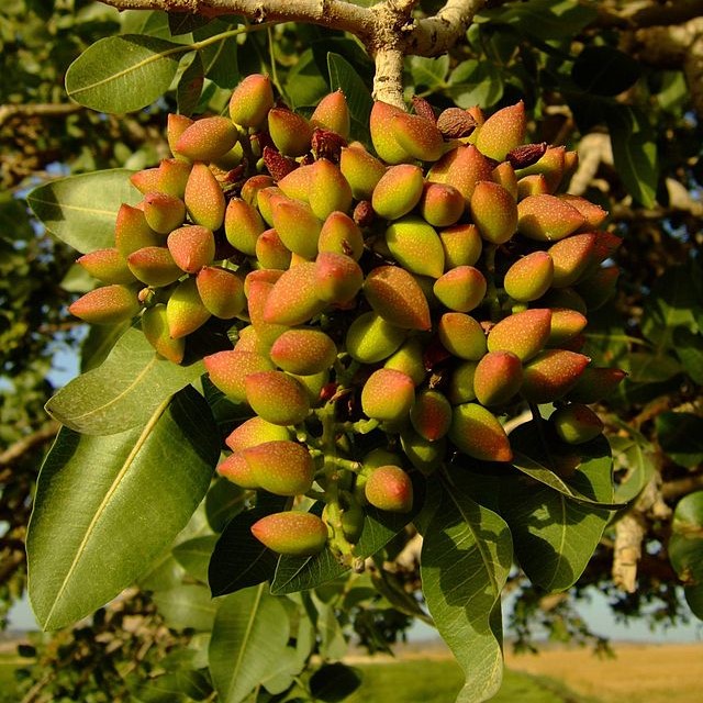 Perfectly suited to cold, semi-arid climates, the Pistachio offers a low-maintenance, water-wise option for gardens in climates typically reliant on irrigation. For millennia, Pistachio fruits have graced Western and Central Asian cuisines, but are now celebrated globally for their easily shelled nuts and delicious flavour. Botanically classified as a drupe, similar to Peaches, Mangoes or Avocado, Pistachios often naturally split open once they’re ripe. Whether enjoyed as a roasted snack or incorporated into desserts like ice cream, Pistachios lend themselves to a diverse array of culinary applications. Pistachios can be used in Baklava, incorporated into Turkish Delight, or as a crunchy garnish atop savoury rice dishes like Pilau. Native to the cold, semi-arid deserts of Central and West Asia, Pistachios thrive in climates characterized by cold, brisk winters boasting over 1000 chill hours, and scorching, arid summers essential for proper flowering and fruiting. While tolerant of soil salinity, Pistachios do not fare well in coastal climates due to the mitigating effects on temperature, which hinder the distinct temperature fluctuations necessary for optimal production. Ideally suited for water-wise, arid gardens, Pistachio trees require minimal irrigation in semi-arid climates to encourage prolific flowering and fruiting. Pistachios tolerate dry, calcareous soils with a relatively high pH up to 8.5, typically necessitating no soil adjustments. A full sun position is crucial and a well-draining, sandy loam soil is ideal. Pistachio may crop biannually, yielding bountiful harvests every second year. Pistachio are dioecious, with plants being either male or female and requiring cross-pollination in order to set fruit, one single male plant may be capable of fertilising up to 15 female plants. Pistachio trees are dioecious, meaning they are either male or female, and require cross-pollination to produce fruit. Remarkably, a single male plant has the potential to fertilise up to 15 female plants. Adorned with dense clusters of dark red flowers that give way to small, reddish-tinged fruits, the Pistachio tree presents an enchanting spectacle during both flowering and fruiting seasons. Although Pistachio trees can reach heights of up to 10 metres, they can be pruned to a more manageable size below 3 metres to facilitate harvesting and maintenance. Pistachio trees boast deciduous foliage composed of pinnate gray-green leaves, forming a low-spreading canopy. Embrace the climatic rigours of arid regions and savour the satisfaction of cultivating your own delectable, homegrown Pistachios.