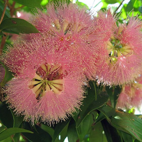 Riberries are a popular ornamental choice, often grown as hedges due to their dense, compact form that responds well to pruning. They feature the typical attractive foliage of the Syzygium genus, with new growth emerging as a vibrant, bright pink that transitions through shades of pink, bronze, and light yellow before maturing into glossy green leaves. Like many members of the Myrtaceae family, they produce beautiful inflorescences with pom-pom-like clusters of colorful stamens, ranging from white to pink and every shade in between. Riberries are an excellent food source for local wildlife, with their flowers attracting pollinators and birds.