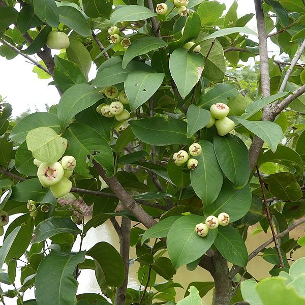 The Rose Apple may not yield the juiciest fruits among the Syzygium varieties but stands out for its productivity, exceptional vigour, minimal maintenance requirements and ornamental appeal. The Rose Apple yields crisp fruits imbued with a delightful rose scent true to their name. Although its fruits tend to not to be exceptionally juicy, they boast a pleasant sweetness, crisp texture, and subtle flavour akin to rose petals. Moreover, both the fruits and flowers emanate a magnificent rose-like fragrance, enhancing the garden’s ambiance. Crisp, refreshing, and light, the Rose Apple serves as the perfect garden snack during the hot, summer months. Fruits are also well-suited to being stewed with sugar, or through preservation in jams or jellies. The appearance of Rose Apples differs notably from other Syzygium varieties like the Wax Jambu or Bell Apple, bearing a closer resemblance to the more distantly related Guava. Rose Apples flourish in tropical, subtropical, and even some warm temperate climates. In tropical regions, they are extremely vigorous and productive, as a result they have become invasive in some areas outside their native South East Asia. Rose Apple can also be cultivated in cooler subtropical/warm temperate climates such as Perth or Sydney, producing well but not in the utter abundance that they do in the tropics. Rose Apples thrive in warm, moist environments with high rainfall, though it can tolerate dry periods as long as soil remains moist. For optimal production and fruit quality, Rose Apples should be provided with plentiful watering and full sun. Mulching throughout the year and additional watering during fruiting is recommended. Rose Apple exhibit adaptability to various soil conditions, including acidic, infertile, and poorly draining soils, although this will diminish their productivity and health. Rose Apple possess elongated, pointed, leathery leaves and develop a dense, evergreen canopy and spreading form that provides year-round shade and ornamental beauty. The true spectacle of the Rose Apple lies in its large, showy white flowers, adorned with long, prominent stamens that adorn the tree for much of the year. Plants vary in mature height but can range between 3-15m tall and are suitable for hedging. Suitable for most climates across Australia, Rose Apples demand minimal maintenance while offering abundant, pleasant fruits.