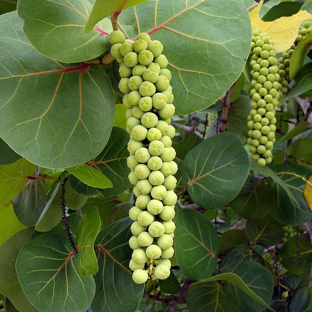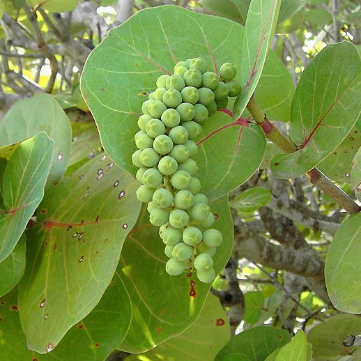 A picturesque and edible plant native to the tropical beaches of the Americas, the Sea Grape serves as a perfect complement to the iconic Coconut. Possessing ornamental beauty, exceptional hardiness, and delicious fruits in abundance, Sea Grapes are an outstanding choice for seaside landscapes. Sea Grapes are borne in abundance, with a pleasantly mild sweet-sour taste reminiscent of Peach, Muscadine Grape, European Grape, and Apple and containing a solitary seed. They are popular for fresh eating but are also commonly used for making jams, jellies, or for transforming into wines. Simply put, Sea Grapes are an extremely low-maintenance plant once established. They have only two primary requirements: ample watering until established and a frost-free climate. While native to the tropical Americas, Sea Grapes can thrive in cool subtropical climates as far south as Sydney or Perth. Their growing needs are minimal, tolerating various soil types, pH levels, and partial shade, though they prefer full sun. Sea Grapes effortlessly withstand strong winds, salt spray, salty soils, drought, and neglect, naturally adapting to coastal conditions characterised by dry seasons, infertile soil, and hurricanes. Once established, Sea Grapes require minimal maintenance, enhancing their appeal as an ornamental specimen. The large oval leaves possess a leathery texture and prominent red veins and a glossy wax-like sheen. They are beautiful throughout all their lifespan; as new growth emerges, it takes on a delicate hue of light brown or orange, gradually transforming into a resplendent green that shines under sunlight. Eventually, the dying foliage transitions into a magnificent array of oranges, reds, yellows, and purples, reminiscent of the vibrant hues seen in deciduous trees during autumn. The drooping Grape-like clusters of fragrant white flowers are present year-round but emerge predominantly in late spring and early summer. These flowers give way to fruits that mature from green to purple, attracting local wildlife. In ideal conditions, Sea Grapes can grow into large shrubs or small trees up to 15 metres tall, but they can easily be maintained at lower heights or as hedges. Hedges of multiple plants are especially ideal, as plants require both male and female plants for pollination. When allowed to grow as trees, their twisting trunks and vase shape give plants an intriguing beauty. With its combination of beauty, resilience, and tasty fruits, the Sea Grape is a delightful and low-maintenance addition to any home landscape.